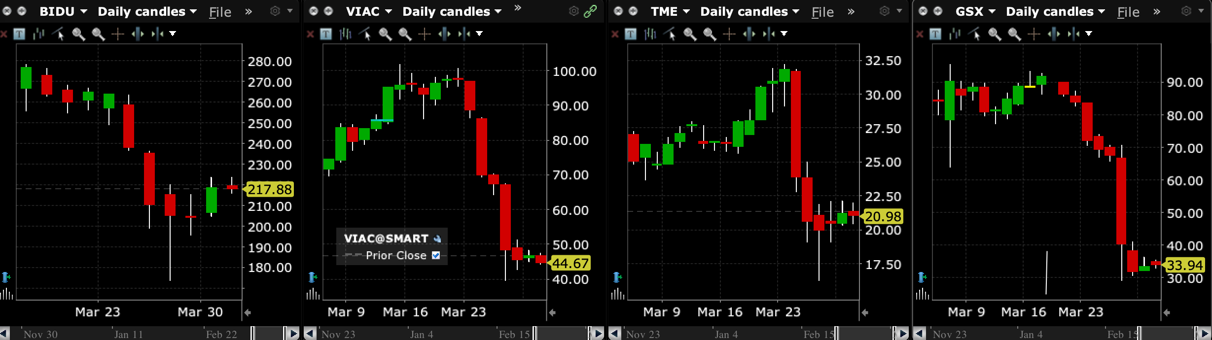 And move the market they did! Here's the daily charts of just four of the stocks (BIDU, VIAC, TME, GSX) that Archegos had derivative positions in, over the last week:
