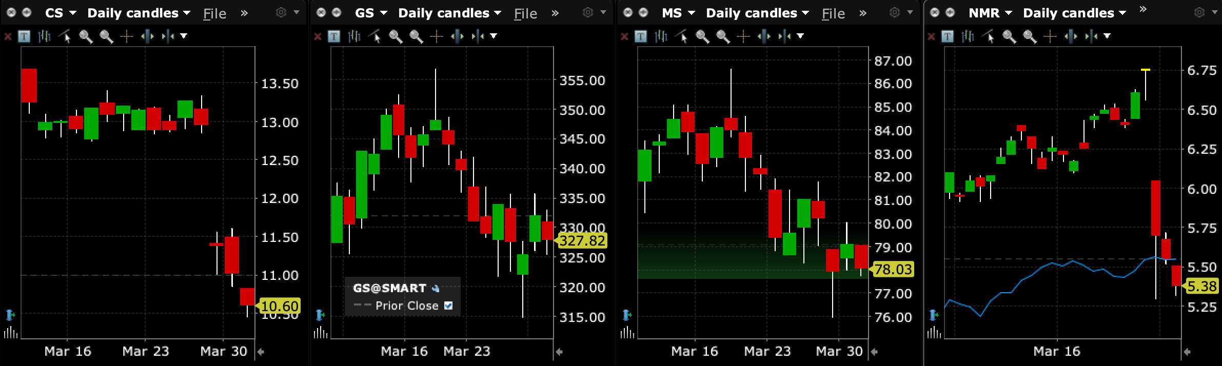 Bank stocks have taken a hit across the board this week, despite Goldman and Morgan Stanley trying to reassure the markets that they got out in time.